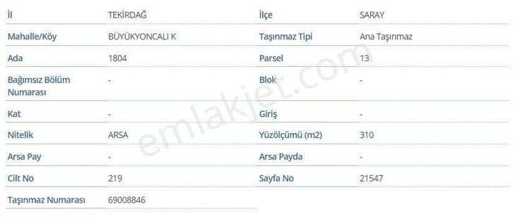 Sahibinden Tekirdağ Saray Büyükyoncalı 310m2 Arsa